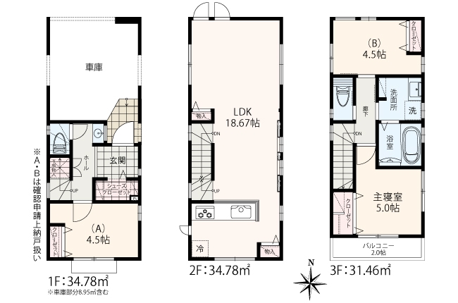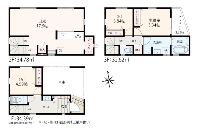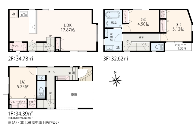 【建物面積】 89.55㎡~92.16㎡ ※各棟別途車庫部分あり